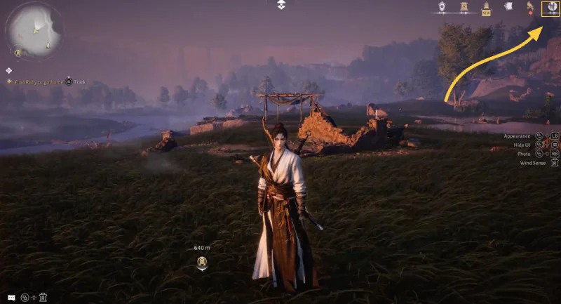 افتح لعبة Where Winds Meet. من الشاشة الرئيسية، اضغط على الأيقونة البيضاء في الزاوية اليمنى العليا (غالبًا ما ترمز إلى قائمة الملف الشخصي أو الإعدادات) لفتح القائمة المطلوبة.