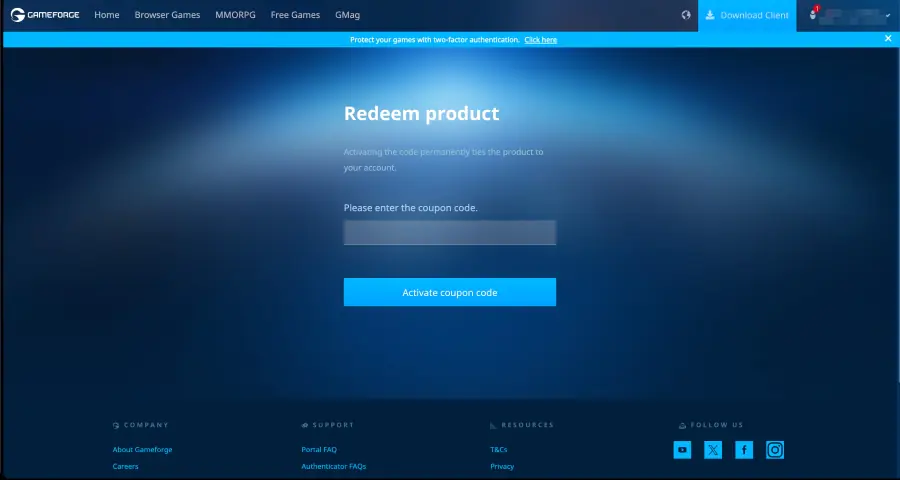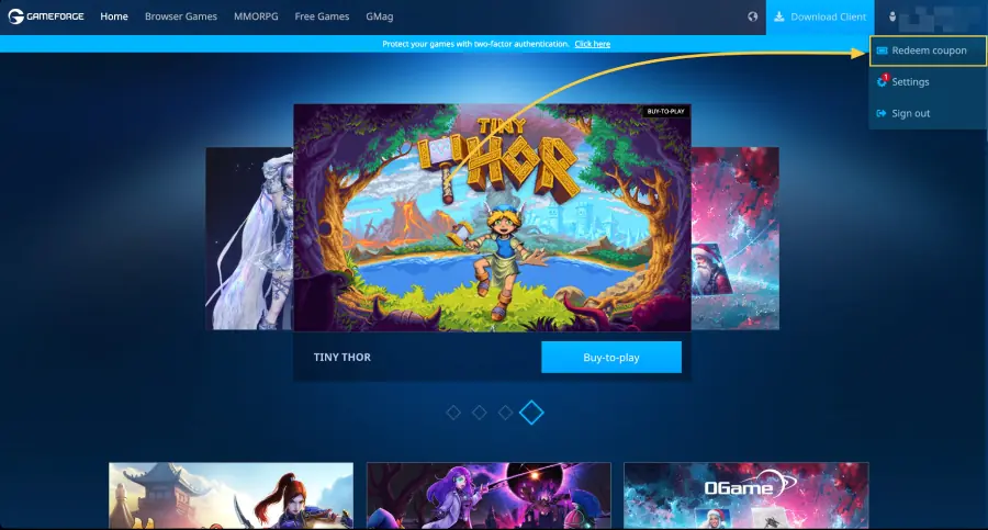 ไปที่เว็บไซต์ Gameforge และคลิกที่ชื่อผู้ใช้ของคุณที่มุมขวาบน