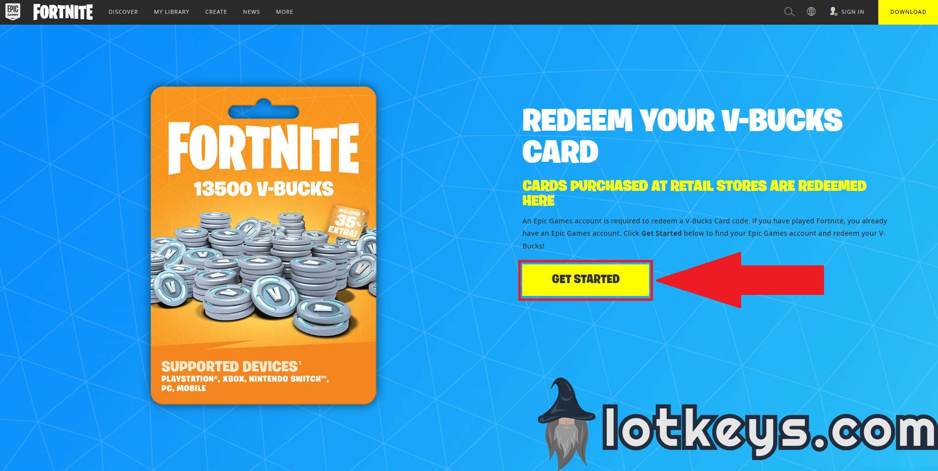 1. Перейдіть на fortnite.com/vbuckscard і натисніть кнопку "GET STARTED".
